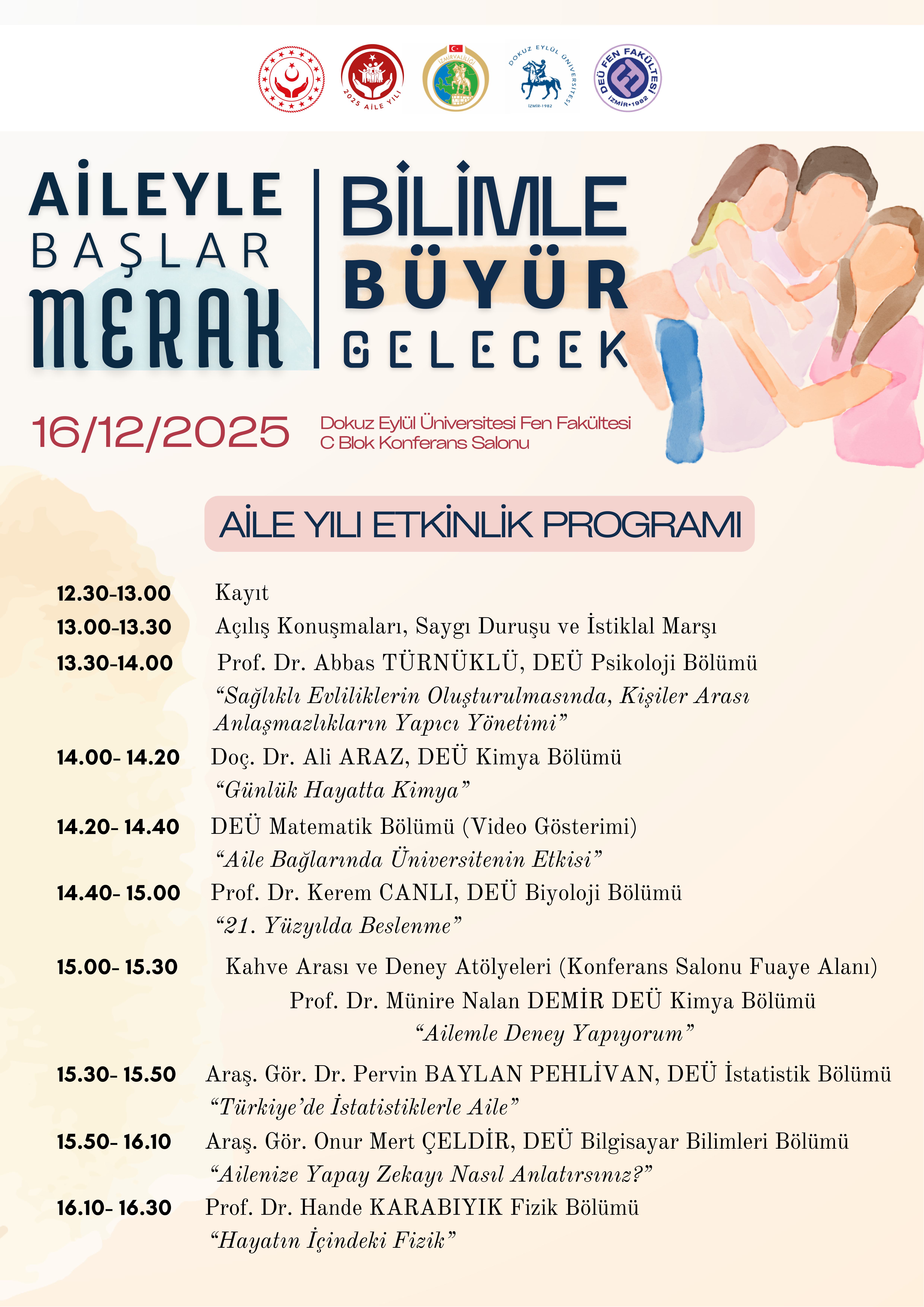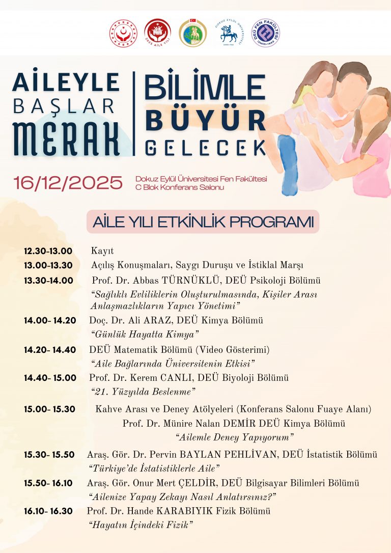2025 Aile Yılı kapsamında; toplumun temel yapı taşı olan aileyi bilimsel çalışmalar ve toplumsal farkındalık etkinlikleriyle desteklemeyi amaçlayan ve “Aileyle Başlar Merak, Bilimle Büyür Gelecek” temasıyla hazırlanan etkinliğimiz, 16 Aralık 2025 tarihinde Dokuz Eylül Üniversitesi Fen Fakültesi C Blok Konferans Salonunda gerçekleştirilecektir.