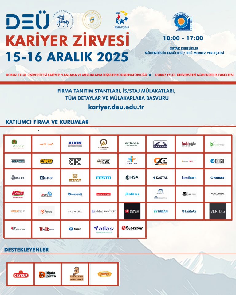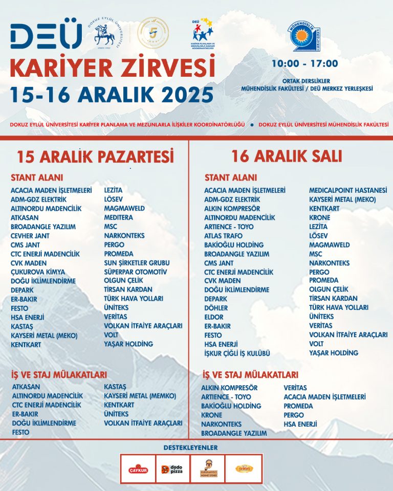 Birçok alandan öğrenci ve mezunumuzun istihdam fırsatlarıyla buluşacağı Zirve, Kariyer Planlama ve Mezunlarla İlişkiler Koordinatörlüğümüz ve DEÜ Mühendislik Fakültesi iş birliği ile 15-16 Aralık 2025 (Pazartesi-Salı) tarihlerinde DEÜ Merkez Yerleşkemizde, Mühendislik Fakültesi Ortak Derslikler Binası‘nda gerçekleşecek.