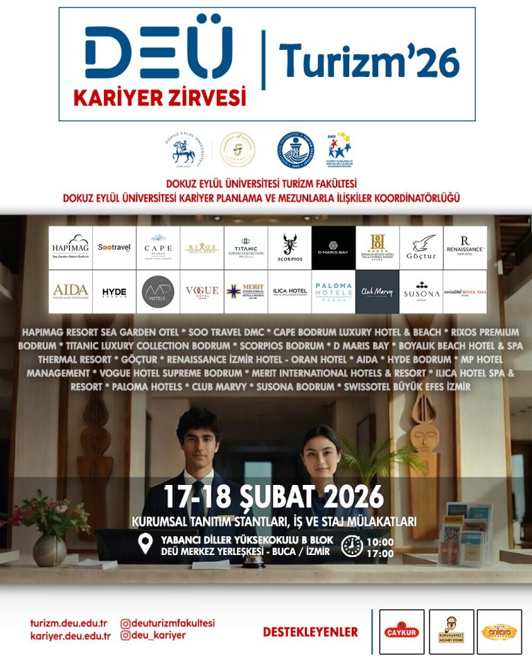 Dokuz Eylül Üniversitesi Turizm Fakültesi ile Kariyer Planlama ve Mezunlarla İlişkiler Koordinatörlüğü iş birliğiyle düzenlenen DEÜ Kariyer Zirvesi: Turizm’26, 17-18 Şubat 2026 (Salı-Çarşamba) tarihlerinde 10.00-17.00 saatleri arasında DEÜ Merkez Yerleşkesi Yabancı Diller Yüksekokulu B Blok’ta gerçekleştirilecektir.