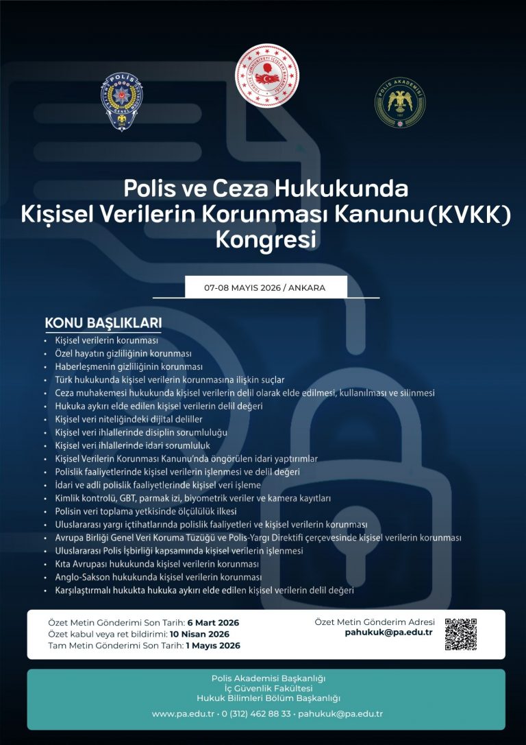 Ankara Polis Akademisi Başkanlığı Gölbaşı Yerleşkesinde gerçekleştirilecek olan Polis ve Ceza Hukukunda Kişisel Verilerin Korunması Kanunu (KVKK) Kongresi kapsamında Türkiye’de kişisel verilerin korunmasına ilişkin temel kanuni çerçeveyi oluşturan KVKK ekseninde polis ve ceza hukuku özelinde kişisel verilerin korunmasına ilişkin düzenleme ve uygulamaların incelenmesi amaçlanmaktadır. Bu kapsamda kongrenin amacı, söz konusu alanlarda çalışan akademisyenleri uygulayıcıları ve politika yapıcıları bir araya getirerek güncel sorunları tartışmak, çözüm önerileri geliştirmek ve iyi uygulama örneklerini paylaşmaktır. Böylece kişisel verilerin korunması konusunda daha güçlü bir kurumsal kültürün oluşmasına, hukuki çerçevenin geliştirilmesine ve uygulamada karşılaşılan sorunlara sürdürülebilir çözümler üretilmesine katkı sunulması hedeflenmektedir.
