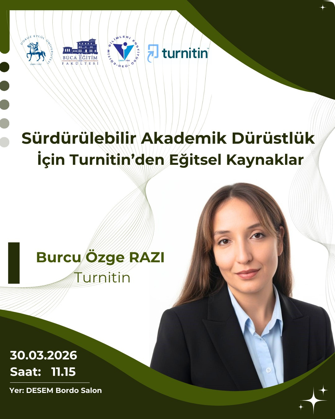 Dokuz Eylül Üniversitesi Eğitim Bilimleri Enstitüsü ile Buca Eğitim Fakültesi iş birliğinde düzenlenecek etkinlikte, akademik dürüstlüğün sürdürülebilirliğini destekleyen Turnitin eğitsel kaynakları ele alınacaktır.