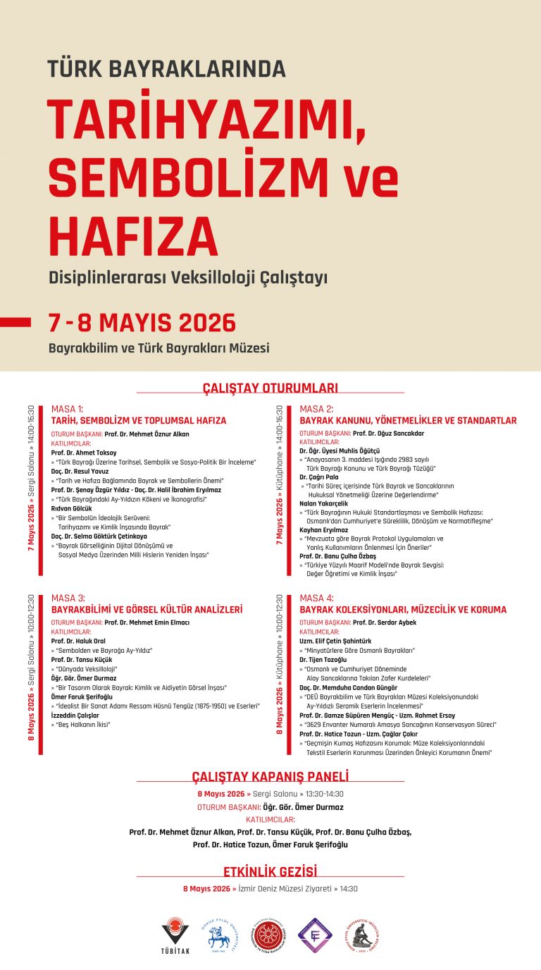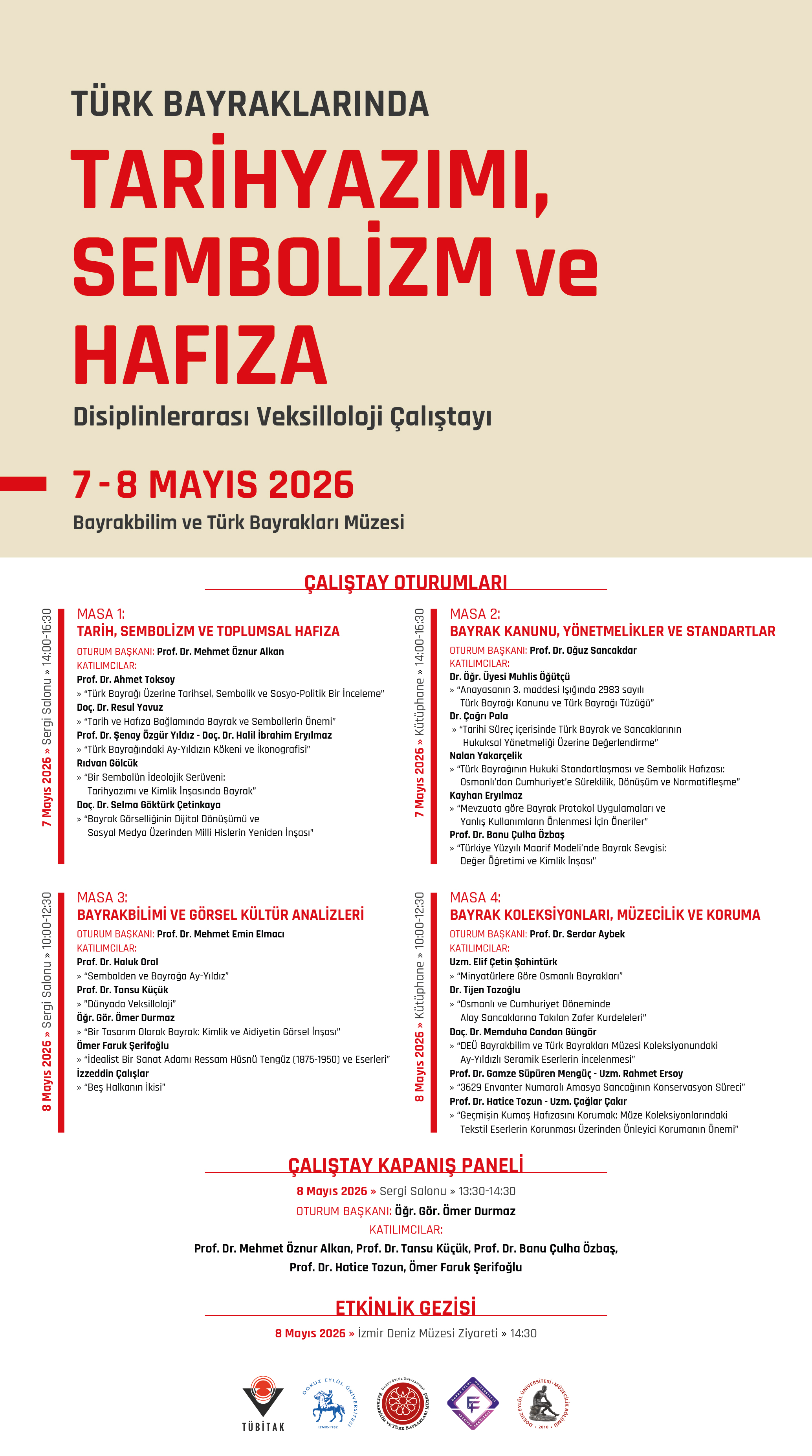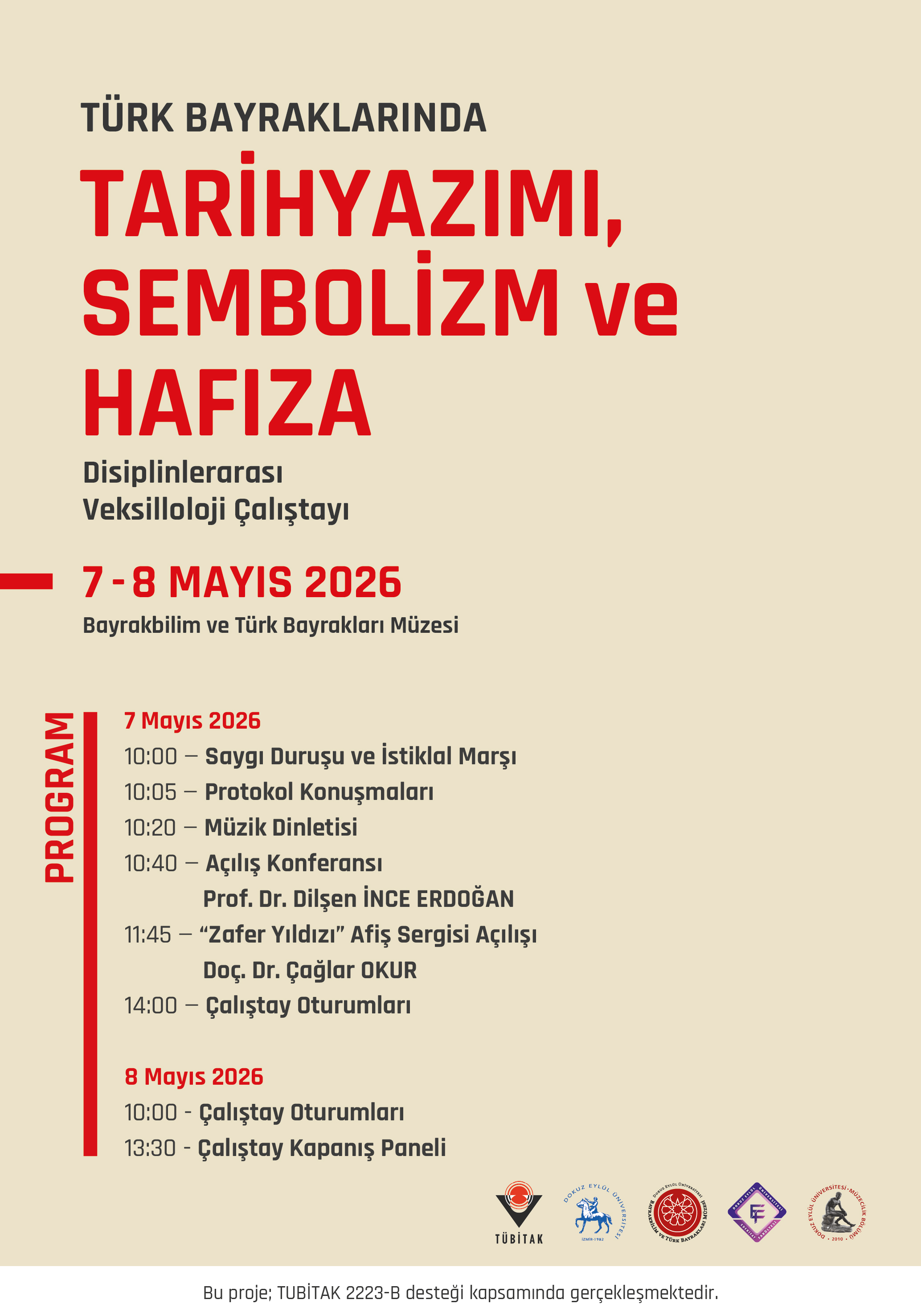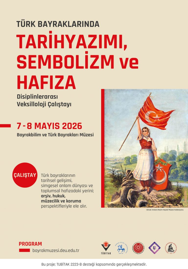 Dokuz Eylül Üniversitesi Bayrakbilim ve Türk Bayrakları Müzesi tarafından organize edilen ve TÜBİTAK 2223-B Yurtiçi Bilimsel Etkinlik Düzenleme Desteği kapsamında desteklenmeye hak kazanan “Türk Bayraklarında Tarihyazımı, Sembolizm ve Hafıza: Disiplinlerarası Veksilloloji” başlıklı çalıştay, Müzemiz Uzmanı Öğr. Gör. Dr. Betül TEOMAN yürütücülüğünde 7–8 Mayıs 2026 tarihlerinde Dokuz Eylül Üniversitesi Bayrakbilim ve Türk Bayrakları Müzesi ev sahipliğinde gerçekleştirilecektir.