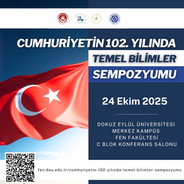 Dokuz Eylül Üniversitesi Fen Fakültesi olarak, Cumhuriyetimizin 102. yılı anısına 24 Ekim 2025 tarihinde Fen Fakültesi Konferans Salonu’nda gerçekleştireceğimiz “Cumhuriyet’in 102. Yılında Temel Bilimler Sempozyumu”na sizleri davet etmekten memnuniyet duyarız.