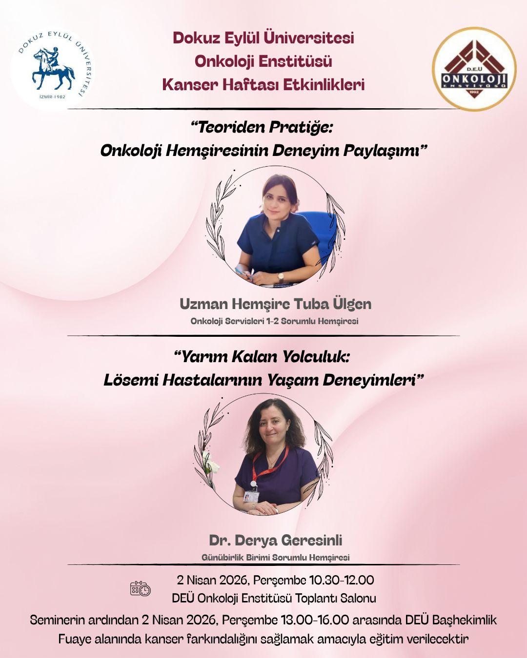 Onkoloji Enstitüsü 1-7 Nisan Kanser Haftası etkinlikleri kapsamında 2 Nisan 2026 tarihinde Dokuz Eylül Üniversitesi Onkoloji Enstitüsü Toplantı Salonunda 10.30 – 12.00 saatleri arasında Onkoloji Servisleri Sorumlu Hemşiresi Uzm. Hemşire Tuba ÜLGEN tarafından “Teoriden Pratiğe: Onkoloji Hemşiresinin Deneyim Paylaşımı” ve Günübirlik Birimi Sorumlu Hemşiresi Dr. Derya GERESİNLİ tarafından “Yarım Kalan Yolculuk: Lösemi Hastalarının Yaşam Deneyimleri” konulu seminerler düzenlenecektir.